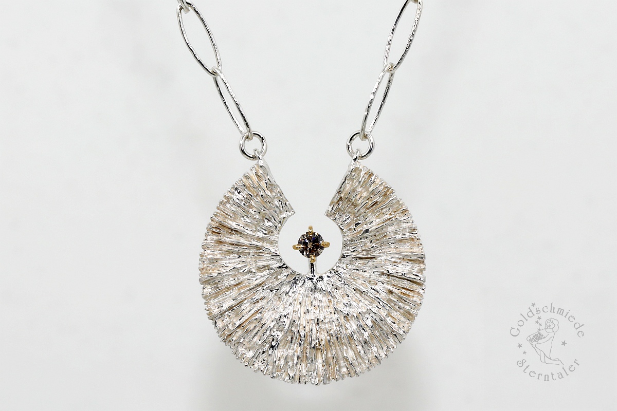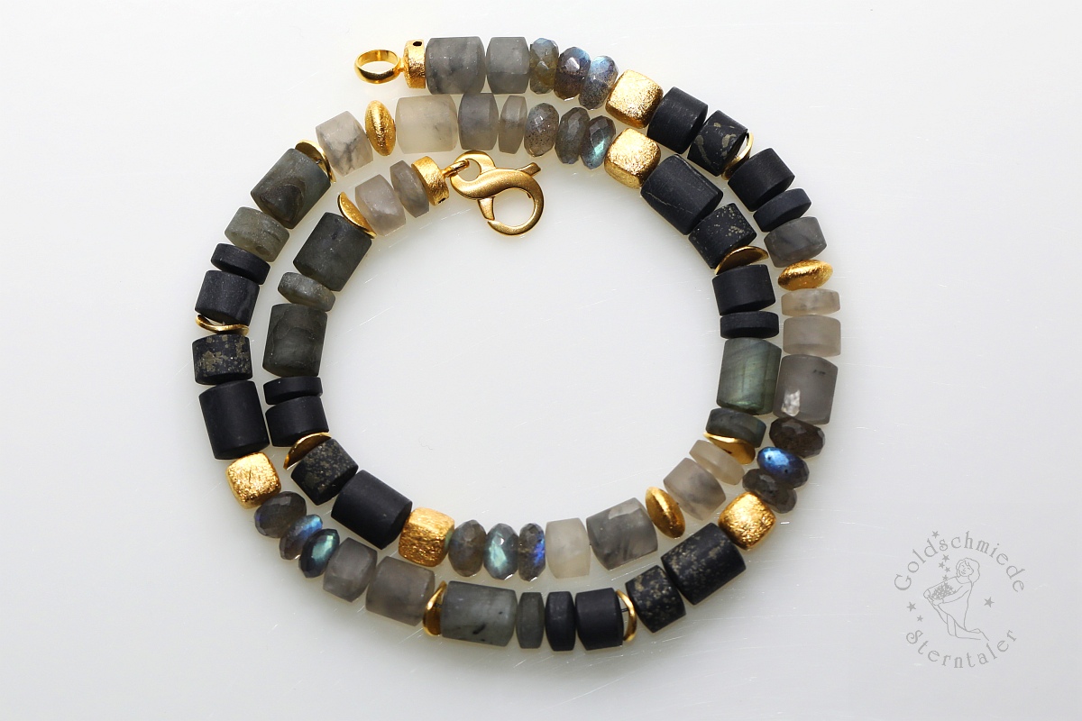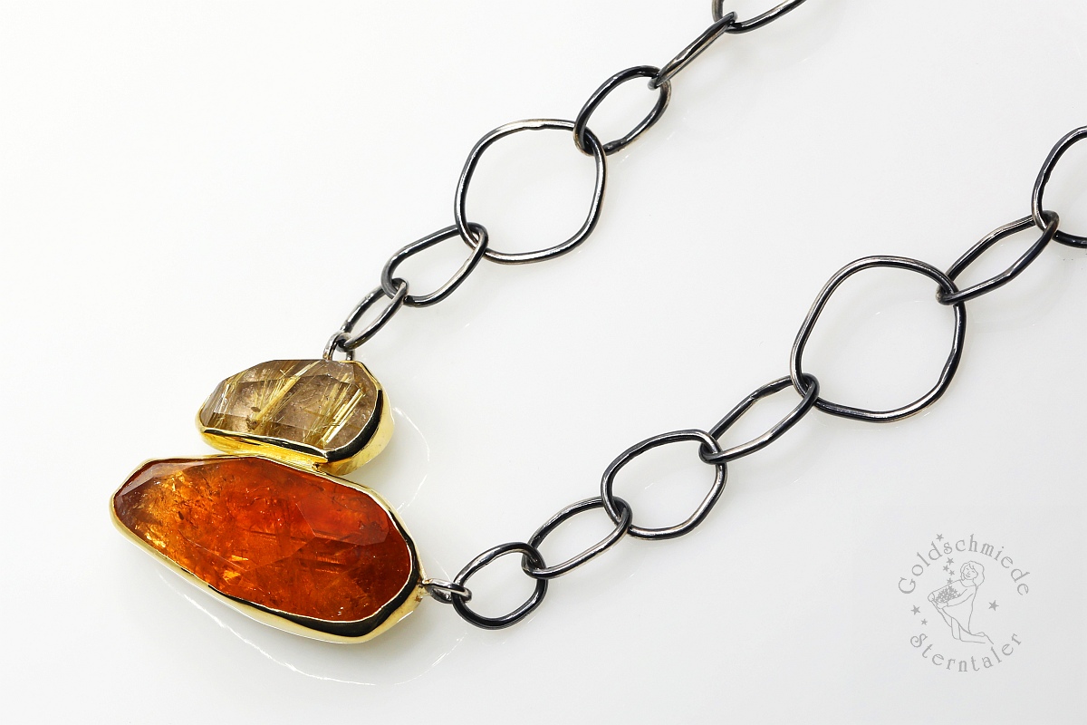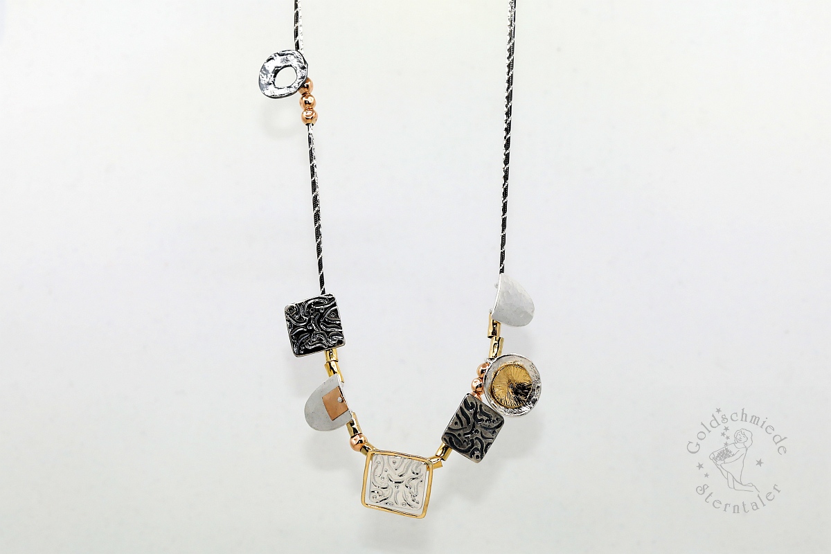 Kennzeichnend für den Halsschmuck aus meiner Goldschmiede ist die Vielfalt an Farben, Formen und Materialien. Nicht nur Kombinationen aus unterschiedlichen Metallen mit farbigen Edelsteinen, Perlen oder Diamanten haben hier ihren Auftritt, sondern auch untypische Verbindungen, wie zum Beispiel mit antikem Glas, Holz oder Jade.