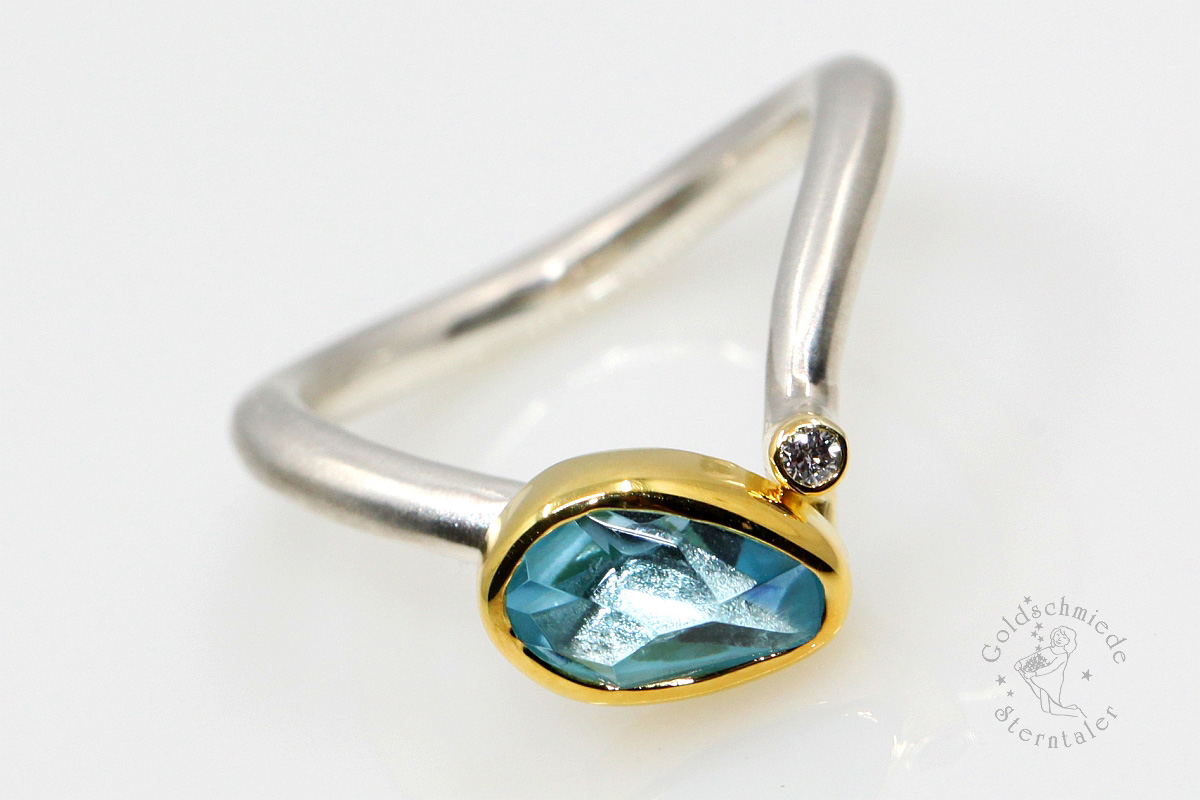 Ring aus Silber und Gold mit einem Aquamarin und Brillanten