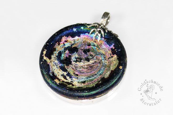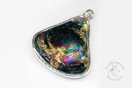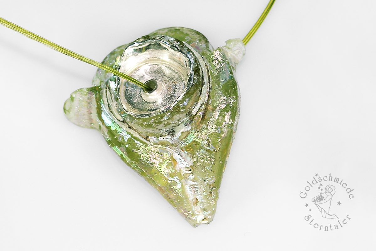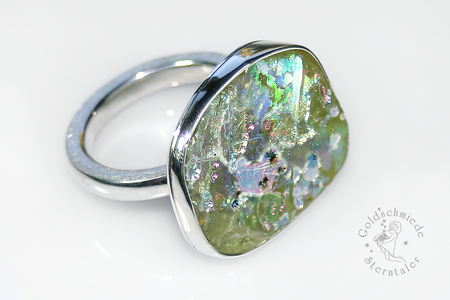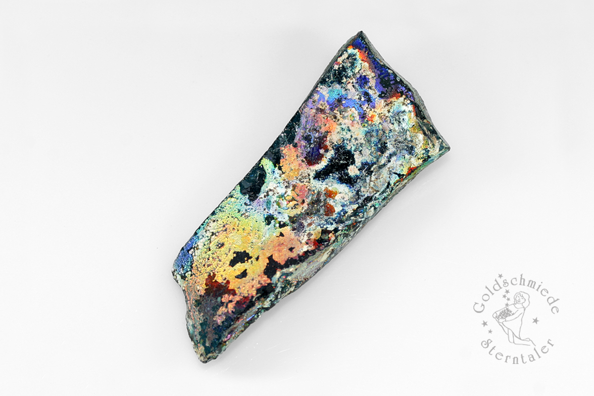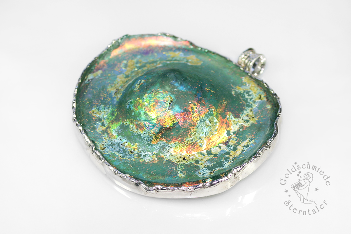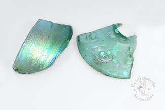 Bei der Lagerung im Boden wird die Oberfläche der Gläser häufig durch die Feuchtigkeit des Erdreiches stark angegriffen. Sie laugt aus, hebt sich vom Grund und ermöglicht so der Luft, zwischen die Schichten einzudringen. Es entsteht ein farbiger Iris-Schimmer, den so viele römische Bodenfunde aufweisen und der ihnen einen zusätzlichen Zauber verleiht.